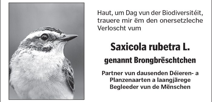 Mir hunn eis als Mouvement Ecologique – gemeinsam mat der « Association des biologistes luxembourgeois » an natur&ëmwelt – decidéiert en aussergewéinleche Wee ze goen, fir op dat weltwäit Arten- a Planzestierwen opmierksam ze maachen. Lëtzebuerg as dobäi keng Insel: och bei eis am Land stelle mir e massivt Aarten- a Planzestierwe fest, an och … Aussergewéinlech Doudesannonce weiterlesen