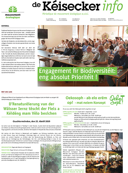 De Bericht iwwer d’Generalversammlung 2019, Reouverture vum Oekosoph mam Lou Steichen, Liichtverschmotzung, Invitatiounen op Konferenzen a Wanderungen a nach villes méi an dësem Kéisécker-Info