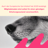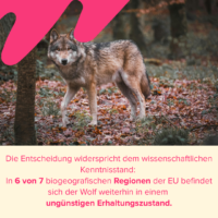Diese politisch motivierte Entscheidung widerspricht dem wissenschaftlichen Kenntnisstand: In sechs der sieben biogeografischen Zonen der EU befindet sich der Wolf weiterhin in einem ungünstigen Erhaltungszustand. Wissenschaftler:innen und Fachinstitutionen haben die EU-Entscheidung entsprechend deutlich kritisiert.