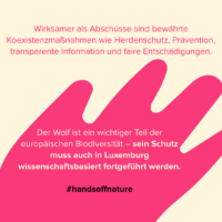 Der Wolf ist ein wichtiger Bestandteil europäischer Biodiversität, dessen Rückkehr ein bedeutender Naturschutzerfolg ist und nicht gefährdet werden darf. Sein Schutz soll in den Mitgliedstaaten nicht geschwächt, sondern verantwortungsvoll und wissenschaftsbasiert fortgeführt werden, so auch in Luxemburg.
