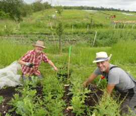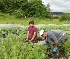 Im Monat Juni traf sich die Gruppe im Betrieb „Vum Gréis“ , der von Yves Diederich Ende 2018 auf einem Familiengrundstück im Roeserbann gegründet wurde. Zusammen mit einer Teilzeitkraft startete er im Jahr 2019 mit 70 Familien, die Gemüse von ihm bezogen. Heute arbeitet er zusammen mit 2 Teilzeit-Arbeitskräften, einem Auszubildenden und Mitgliedern die in ihrer Freizeit Hand im Gemüsegarten anlegen wollen. Der Betrieb versorgt in etwa 110 Familien wöchentlich auf 0,45 ha mit frischem Gemüse und Kräutern, zusätzlich dazu werden auf weiterer Fläche Eier aus mobiler Freilandhaltung für die Mitglieder zum Zukauf erzeugt.