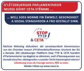 Über die Hälfte der Nationalparlamente Europas haben dem Abkommen bereits zugestimmt. Aber kann dies ein ausreichendes Argument für Luxemburg sein, ebenfalls zuzustimmen, nur weil „andere“ Länder das bereits zum Teil getan haben? Oder stände es nicht auch Luxemburg gut zu Gesicht, hier seine Verantwortung zu übernehmen und sich zum Sprachrrohr von Millionen Menschen in der EU (und Kanada) zu machen? Und: Sich vor allem in den Dienst von Umwelt, Sozialem und Gesundheit zu stellen und über das Wahrnehmen der Belange der BürgerInnen auch der Politikverdrossenheit entgegen zu wirken?