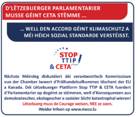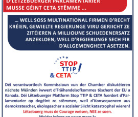 Aufruf der Plattform Stop TTIP & CETA an die Luxemburger Parlamentarier: Bringen Sie den Mut auf und zeigen Sie Verantwortung: stimmen Sie gegen das Freihandelsabkommen zwischen Europa und Kanada – CETA !
