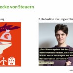 Schauen Sie rein in das Video des sehr interessanten Vortrages, der diese und andere Fakten auf gut verständliche Art und Weise darlegt: zu den betrieblichen Steuern, der generellen Einführung von Erbschafts- und Vermögenssteuern, den unterschiedlichen Steuersätzen zwischen den Einkommensklassen, dem Verhältnis von Mehrwegsteuern und Nettovermögensteuern, die Verteilung der Steuereinnahmen nach Steuerarten, … aber auch Lösungswege aufzeigt.