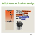 - Das Vermögen der 5 reichsten Menschen (Männer) hat sich seit 2020 mehr als verdoppelt, von über 400 Milliarden auf weit über 800 Milliarden Dollar. Die ärmeren 60 % der Weltbevölkerung, also 5 Milliarden Menschen, wurden im gleichen Zeitraum ärmer. Die Ungerechtigkeiten steigen demnach gravierend an, ebenso wie die Armut.
