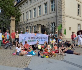 Auch wenn jetzt die Ferien beginnen, fordert Votum Klima* die Regierung mit einer Aktion vor dem Staatsministerium auf, keine weitere Zeit beim Klimaschutz zu verlieren. Es bleiben nur fünf bis maximal zehn Jahre, um einen substantiellen Kurswechsel Richtung Dekarbonisierung einzuschlagen und deshalb ist es wichtig, schnell zu agieren.