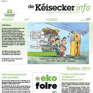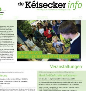 No der Summervakanz laafen beim Mouvement Ecologique d‘Aarbechten op Volltouren fir d‘Oekofoire mam Oekozenter Pafendall ze organiséieren an eis Virschléi am Kader vun de Legislativwahlen ze formuléieren an zur Debatt ze stellen. Beid Theme prägen dann och dëse Kéiséckerinfo.