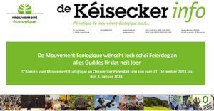 Am Kéisecker info vum Dezember fannt Dir e.a. d’Stellungname vum Méco, Beiträg vu move., der Ëmweltberodung an der ekologischer Bauberodung a villes méi …