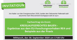 mehr...Energiewochen 2020 – Fachvortrag via Zoom: Kreislaufgerechtes Bauen – Ergebnisse aus dem EU-Forschungsvorhaben RE4 und Beispiele aus der Praxis
