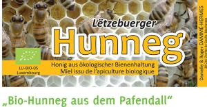 Dëst Joer konnten d’Beien, déi hannert dem Oekozenter bei der Uelzecht logéiert waren, fläisseg Nektar sammelen. Ënn Juli konnt e gudden an aromateschen Hunneg geschleidert ginn. Dir kritt dësen Hunneg an 250 g Glieser am Oekozenter Pafendall oder am Oekosoph fir de Präis vun 3.40 € ze kafen.