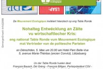 Nohalteg Entwécklung an Zäite vu wirtschaftlecher Kris: eng national Table Ronde vum Mouvement Ecologique mat Vertrieder vun de politesche Parteien