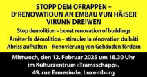 more...The Mouvement Ecologique is joining forces with ten organisations from various sectors in Luxembourg (architecture, heritage conservation, environment, etc.) to support the European citizens’ initiative “HouseEurope!”. The common objective is to collect at least 4,500 signatures in Luxembourg and 1 million at European level to initiate a decisive change and make renovation simpler, less expensive and more accessible than demolition in Luxembourg and throughout Europe.