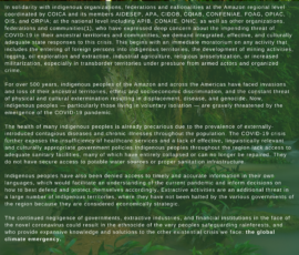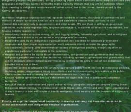 Il y a actuellement plus de 1500 cas de COVID-19 en Amazonie, juste une semaine après que le premier cas ait été signalé dans une communauté isolée. La propagation rapide du virus pourrait potentiellement conduire à un ethnocide. Par conséquent, à la suggestion de nos partenaires indigènes, les appels comprennent un moratoire sur toutes les activités minières, la déforestation, la production et l’exploration pétrolière, l’agriculture industrielle et le travail missionnaire évangélique à l’intérieur ou aux frontières des zones indigènes de l’Amazonie, la fourniture de soins de santé adéquats et une restriction des déplacements vers les zones indigènes.