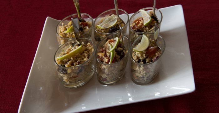 Salade de boulghour avec des raisins secs marinés dans du vin de Porto (végétalien)