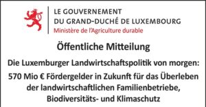 plus...Avis officiel: La politique agricole luxembourgeoise de demain : 570 millions d’euros de subventions à l’avenir pour la survie des exploitations agricoles familiales, la protection de la biodiversité et du climat