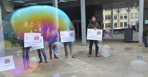 Une action de sensibilisation du Mouvement Ecologique lors de la présentation des résultats Rifkin le 9 novembre 2017 dans le théâtre de Luxembourg Ville.