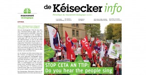 À la une du nouveau Kéisecker-Info : « Do you hear the people sing »: un regard sur la manifestation réussie contre CETA et TTIP, de nombreuses nouvelles des sections régionales et du Pfaffenthal, des conférences intéressantes, un bilan intermédiaire du « Tour du Duerf » et bien plus encore!